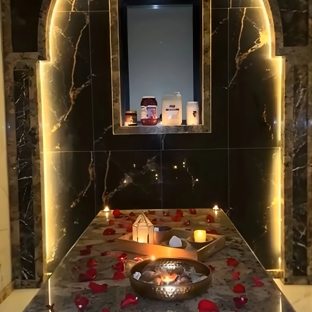 يُغمر الجسم في بخار دافئ يوقظ البشرة ويُليّنها. باستخدام الصابون المغربي الأسود، وقفاز التقشير (الليفة المغربية)، وطين الغاسول، يعمل الحمّام على تنظيف عميق وإزالة الطبقات الباهتة وتغذية البشرة بالمعادن الطبيعية. والنتيجة بشرة أكثر نعومة، وجسم أخف شعورًا، وإحساس منعش بالتجدد للجسم والذهن معًا